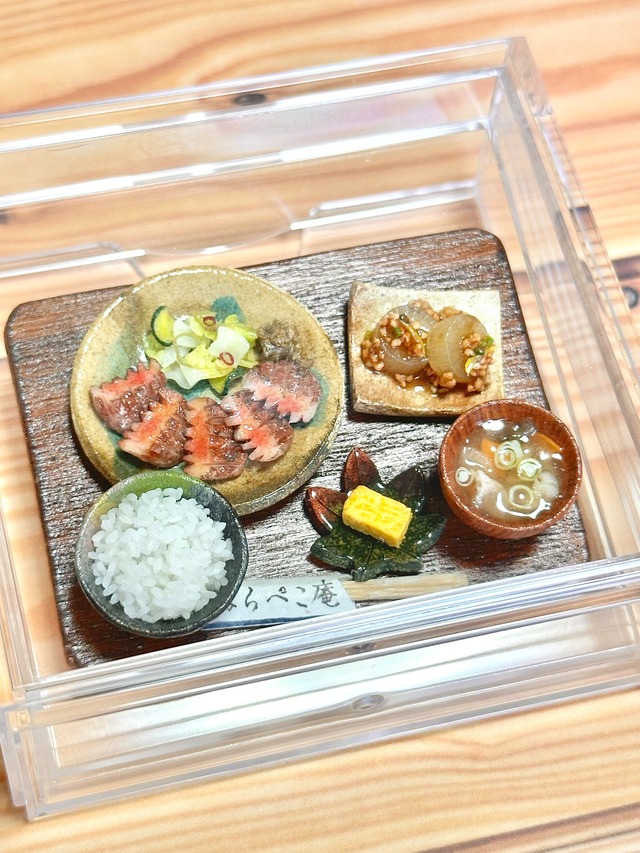 お店がいつどこで営業してるのか、誰も知らない。完全不定期、店主の気まぐれに出現する小料理屋『はらぺこ庵』より新メニューが出ました。 店主の好物の牛タンを贅沢に厚切りにして、白米がすすむ小鉢と汁物をセットにした牛タン定食。 見どころはやっぱりあれですね、牛タンの断面。ちゃんと切れ込みが入ってギザギザになっててね、鮮やかなピンク色が何とも食欲をそそります。 そして主役の脇を固めるのは、白米・カボチャの煮物・具だくさん豚汁に出汁巻きというオールスター。 そしてこの中で一番制作に時間がかかったのはもちろん!言うまでもなく!! …白米です。一粒ずつ作るの毎度本当にたいへん。 こうしてラインナップを見てみると、献立に作者自身の仙台への憧れが多大に反映されているような気がしてきます。まったく公私混同も甚だしい。どなたか、はらぺこ文鳥を仙台に連れてってやってください。 こちらは鑑賞用にぴったりのクリアケースが付きます。埃などの防止に最適。引き出して近くでじっくり眺めてお楽しみいただいても◎。 ※ケース表面や内部に小さな傷やほこり、曇りが見つかる場合がございますが、初期不良ではございません。気にならない方のみご購入ください。