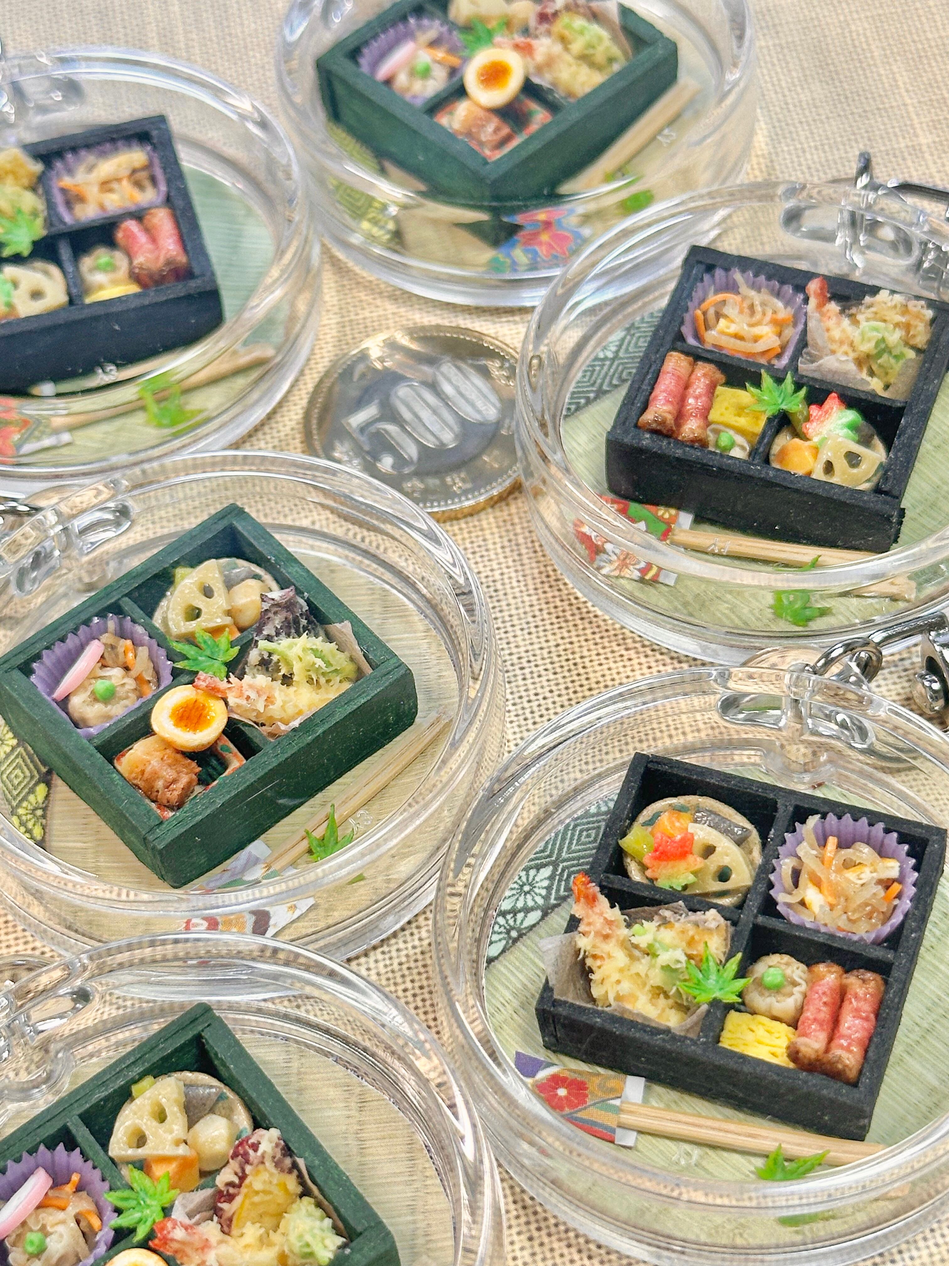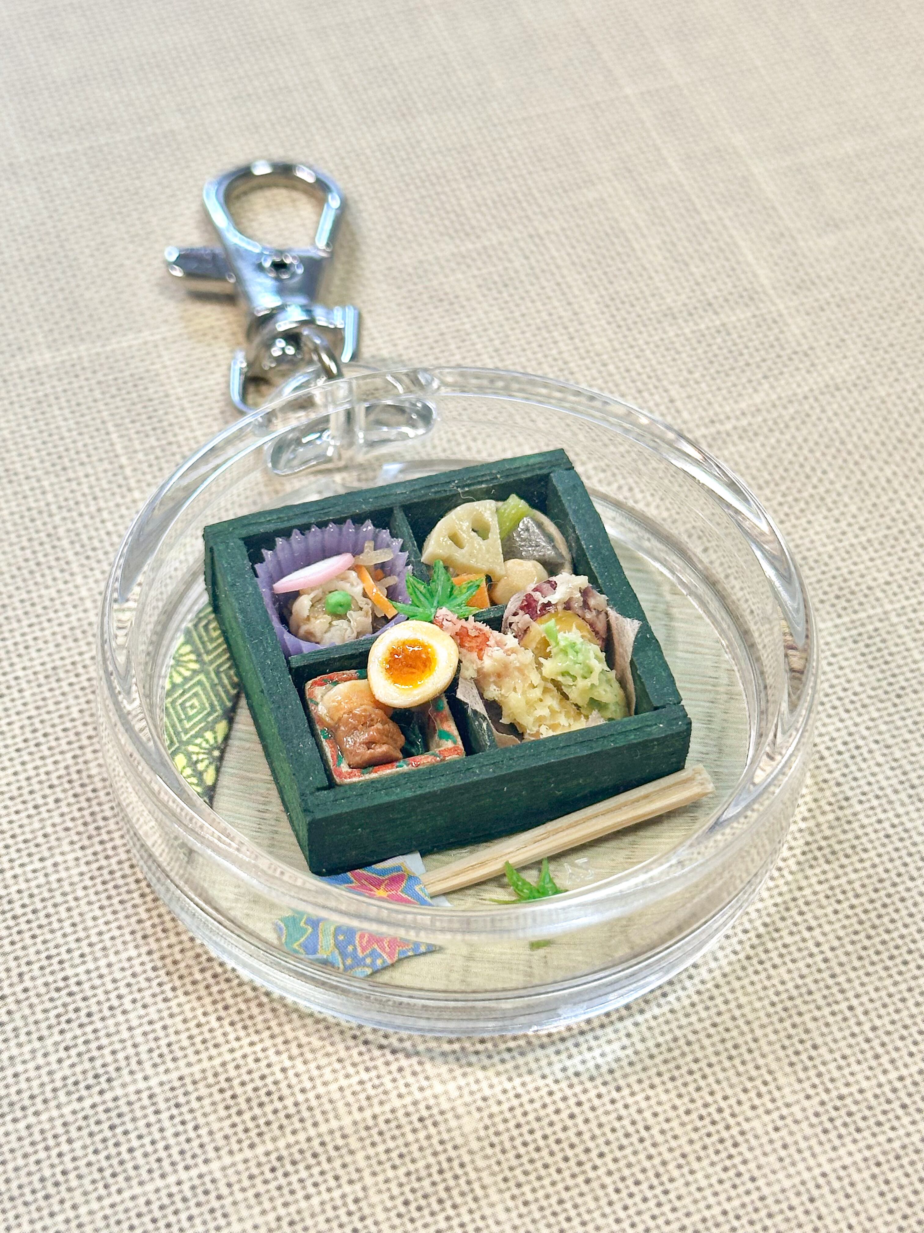 眺めているだけでお腹がすいてくるリアルなミニチュア和食弁当を、カバンにつけてどこへでも持ち歩いていただけます。