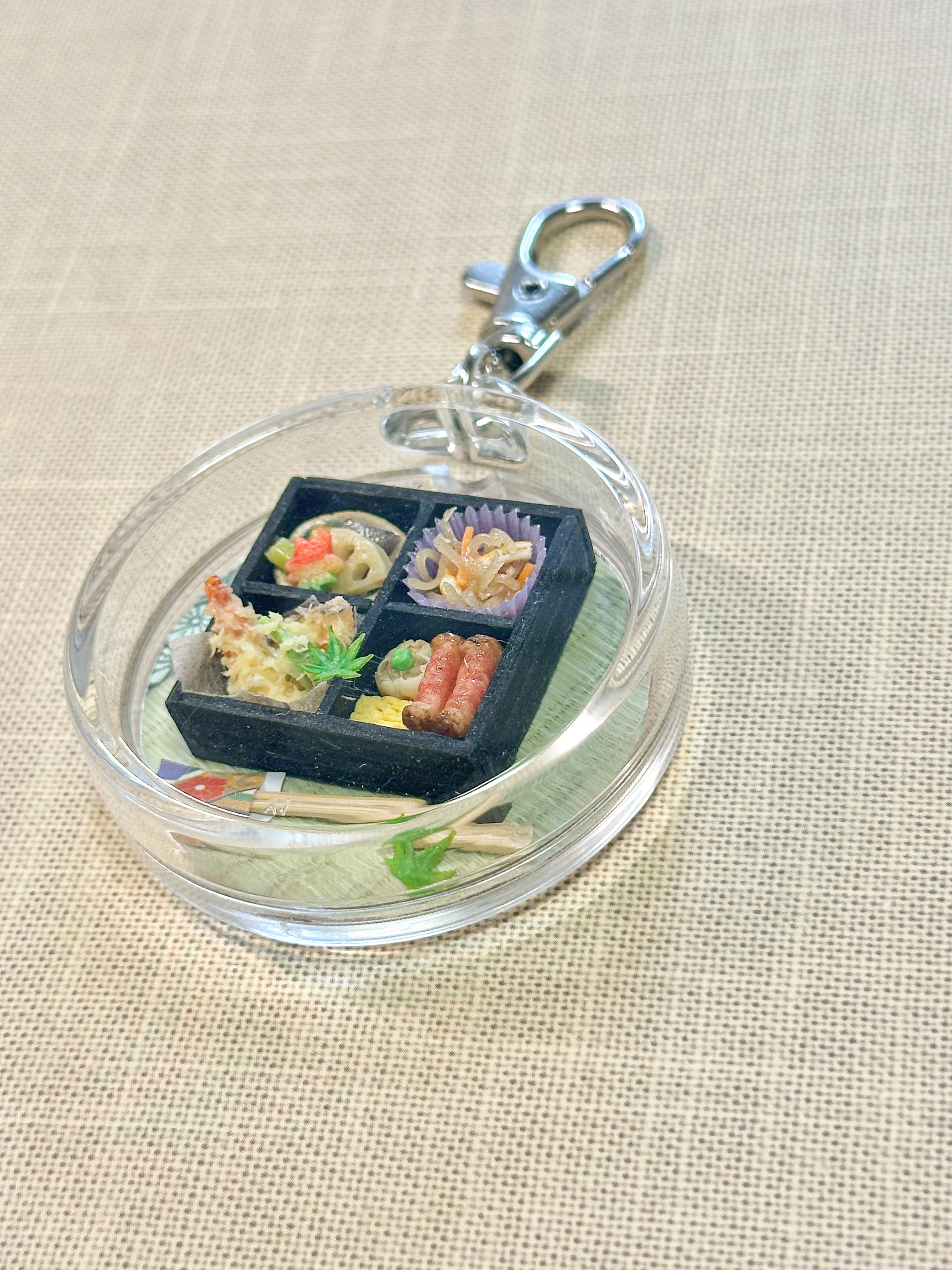 さっくり揚げた天ぷらをメインに、ローストビーフやだし巻き、焼売、きんぴらなどを詰め込んだよくばり和食弁当のミニチュアキーホルダーです。